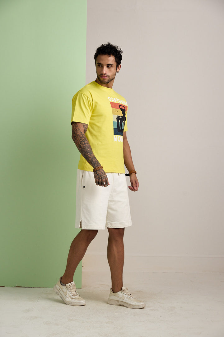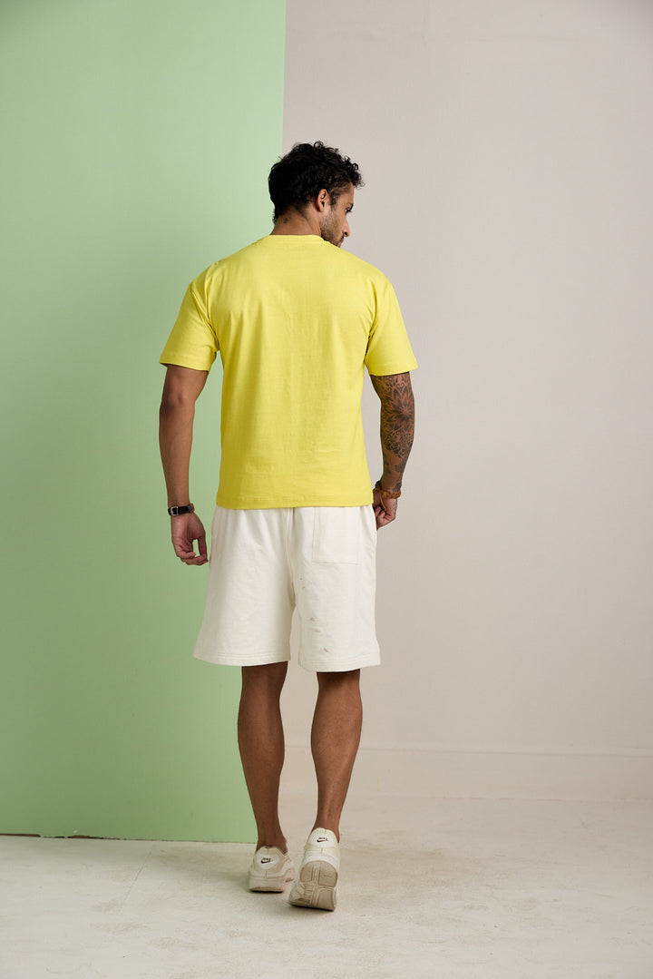 A yellow t-shirt for men with a print on left side. It has a regular fit, so it's comfortable and easy to wear. The t-shirt features a classic round neck and half sleeves, making it perfect for casual, Basic wear.