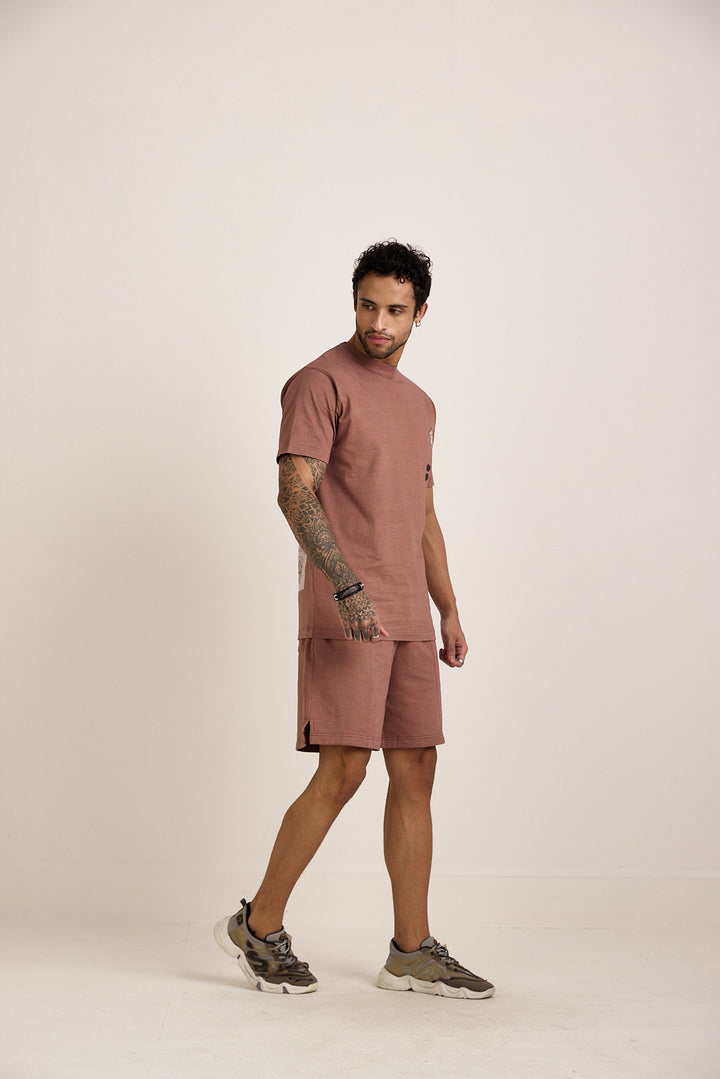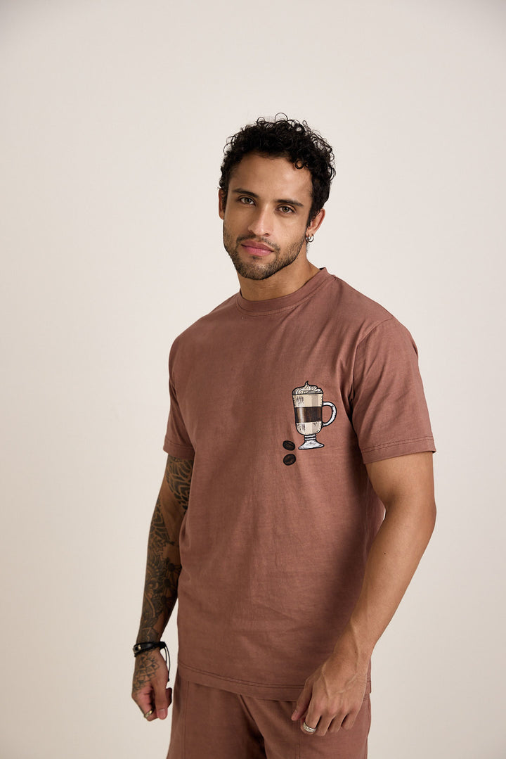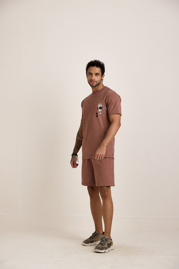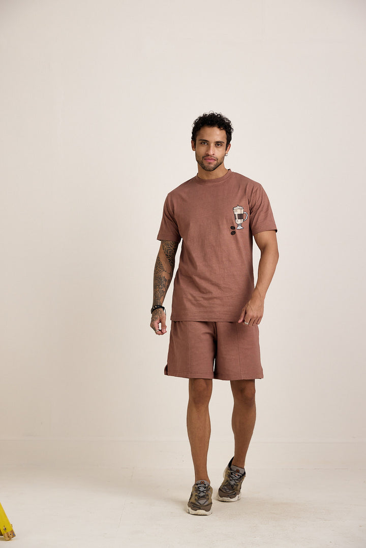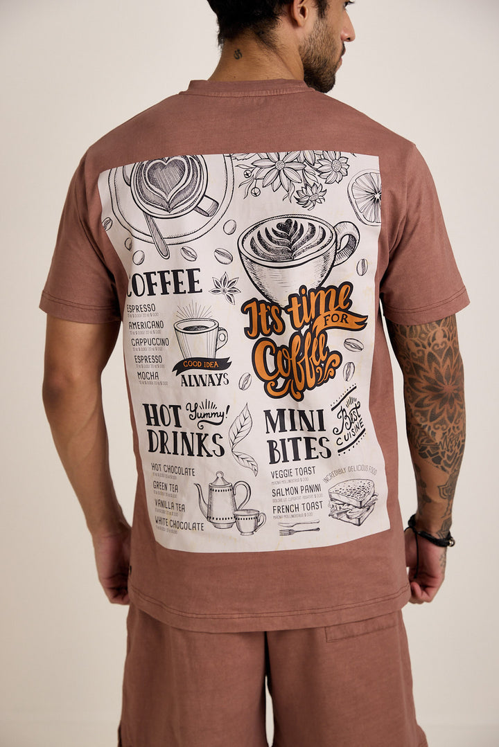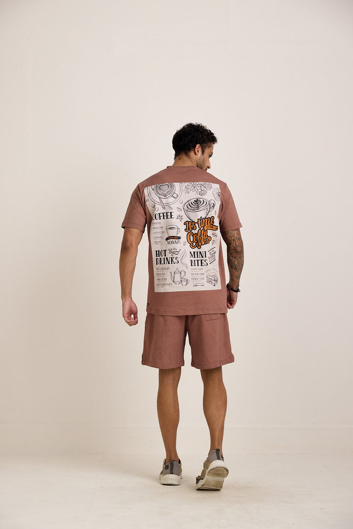 A brown t-shirt for men with a print on front and back. It has a regular fit, so it's comfortable and easy to wear. The t-shirt features a classic round neck and half sleeves, making it perfect for casual, Basic wear.