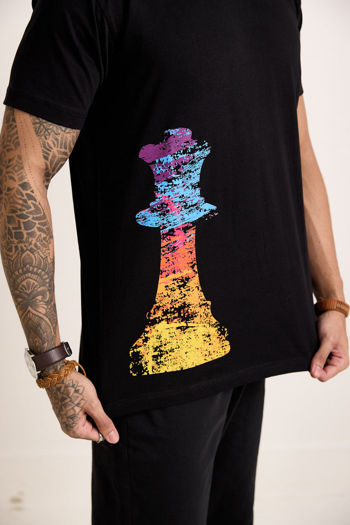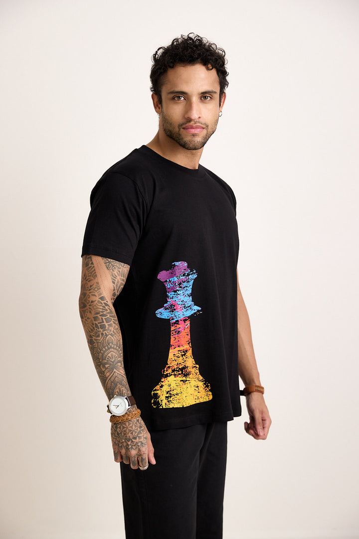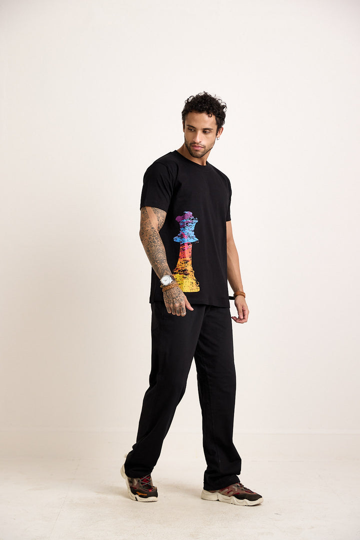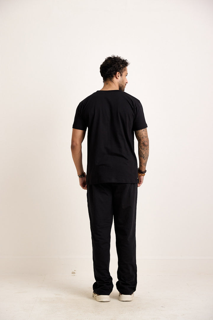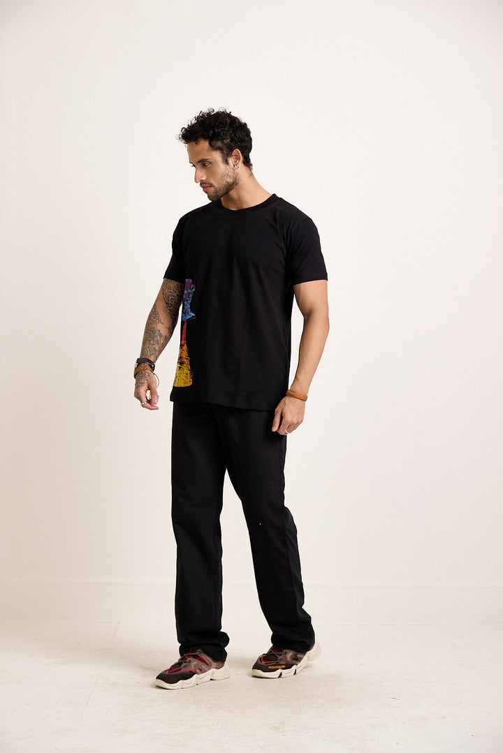 A black t-shirt for men with a print on right side front bottom. It has a regular fit, so it's comfortable and easy to wear. The t-shirt features a classic round neck and half sleeves, making it perfect for casual, Basic wear.