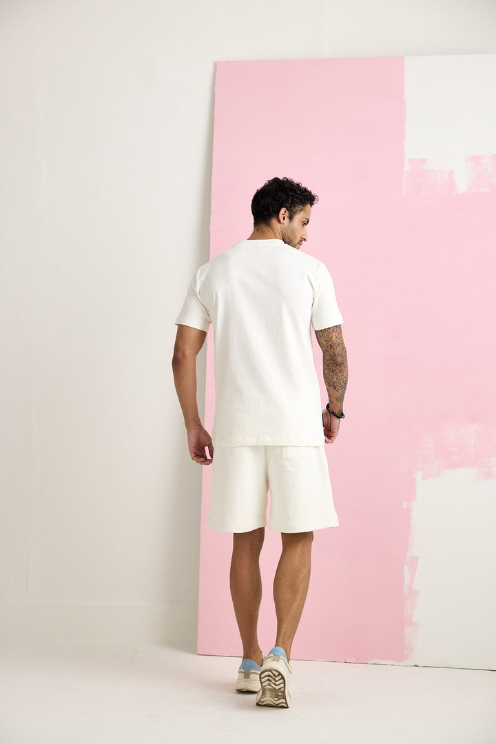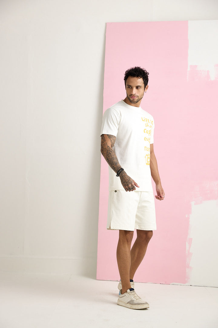 A cool white t-shirt for men with a print on the left side. It has a regular fit, so it's comfortable and easy to wear. The t-shirt features a classic round neck and half sleeves, making it perfect for casual, Basic wear.